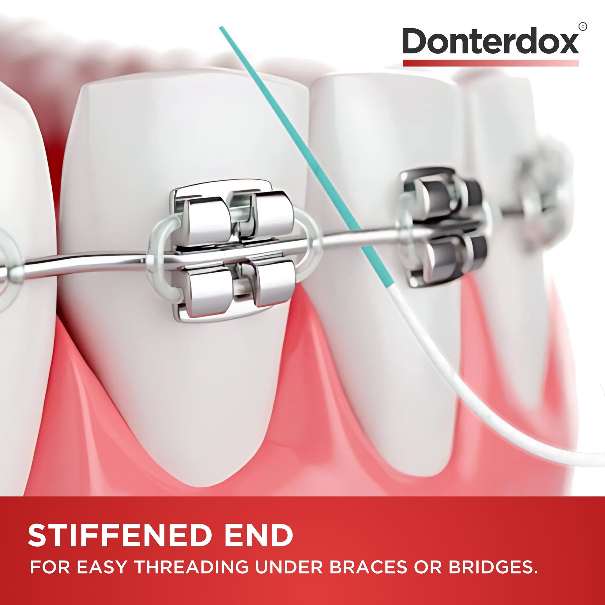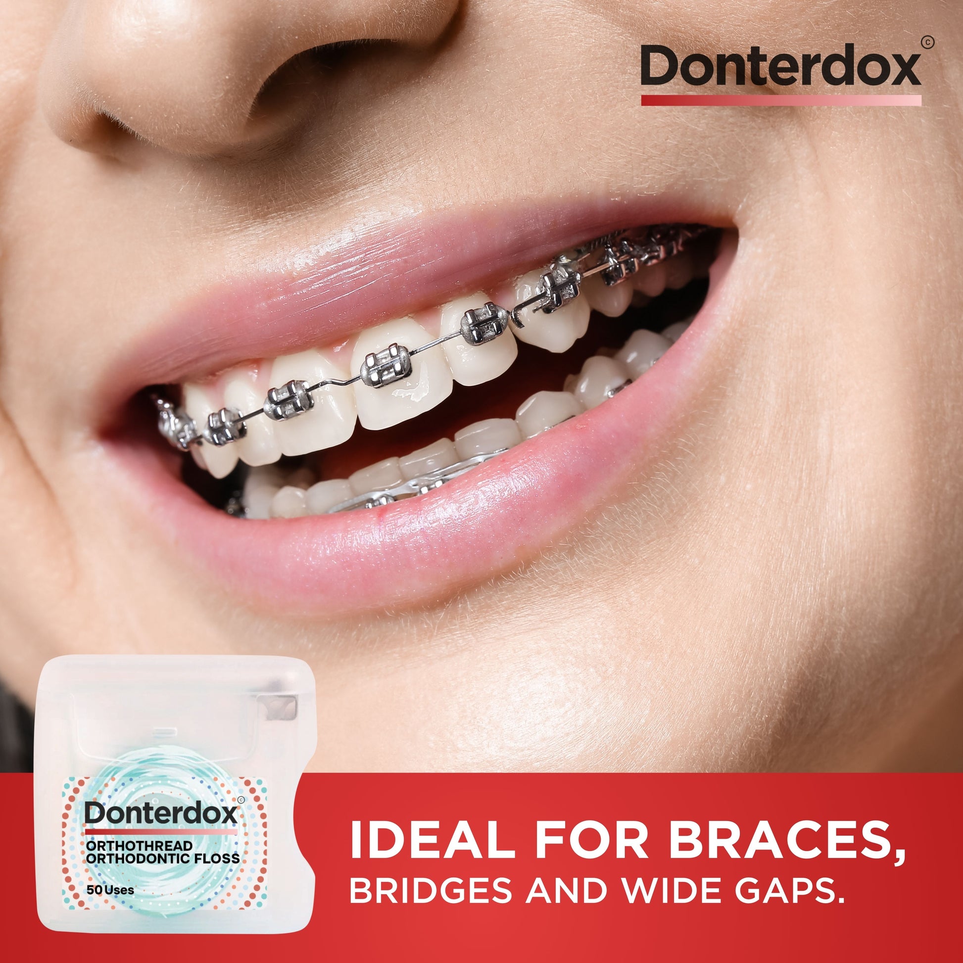 Donterdox OrthoThread is specially designed for people with braces, dental bridges, or wide gaps between teeth. Featuring a stiffened end for easy threading and expanding floss for deeper cleaning, it helps remove plaque and debris from hard-to-reach areas where normal floss can't reach.