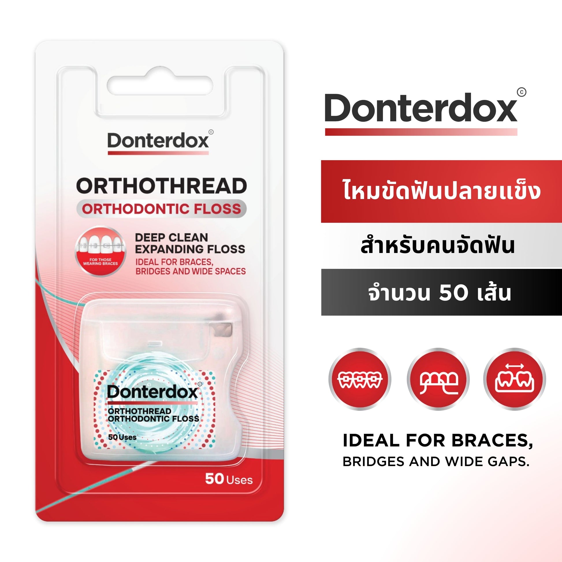 ไหมขัดฟัน Donterdox OrthoThread ออกแบบมาเฉพาะสำหรับผู้ที่จัดฟัน ใส่สะพานฟัน หรือมีช่องว่างระหว่างฟันที่เข้าถึงยาก ด้วยปลายแข็งแบบ Stiffened End ช่วยให้สอดไหมใต้ลวดจัดฟันหรือสะพานฟันได้ง่าย พร้อมเส้นไหมแบบ Expanding Floss ที่จะขยายตัวเมื่อใช้งาน ช่วยให้ทำความสะอาดซอกฟันได้อย่างล้ำลึก